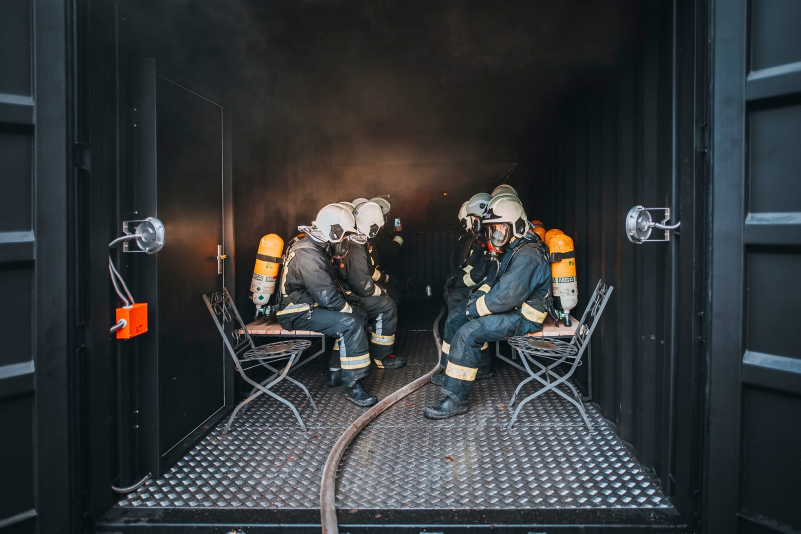 Šonedēļ ugunsdzēsēju glābēju mācību grupa UG1 nostiprina teorētiskās un praktiskās iemaņas darbā elpošanai nepiemērotā vidē dūmu gāzu konteinerī.